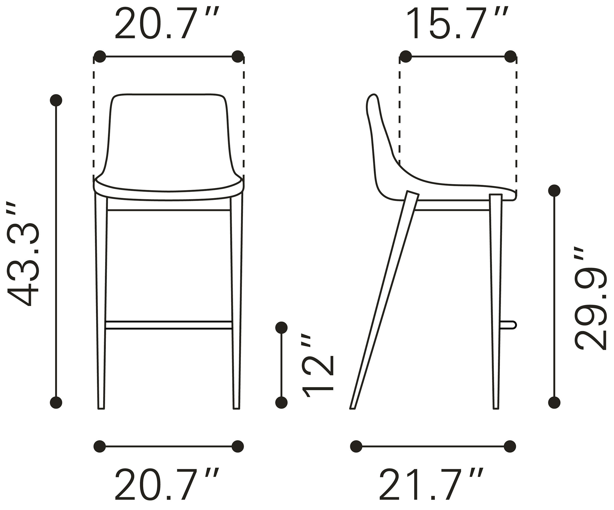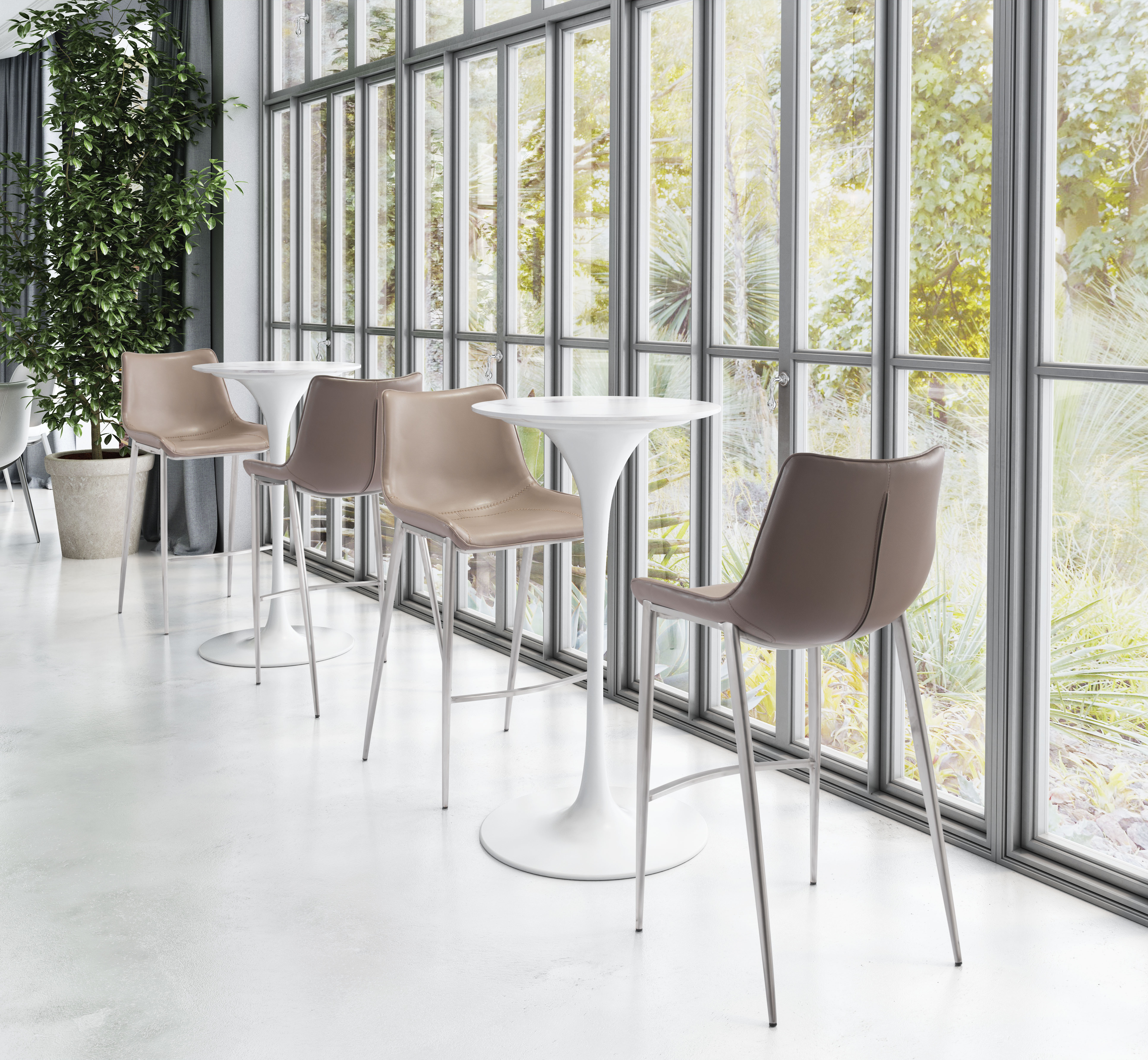 High design meets everyday casual. This handsome barstool with its slim profile pulls up perfectly to the bar. Its super comfortable curved seat is covered in brown faux leather with dramatic stitching. Brushed Stainless Steel legs are complete with protective plastic feet to keep your floors scratch-free.